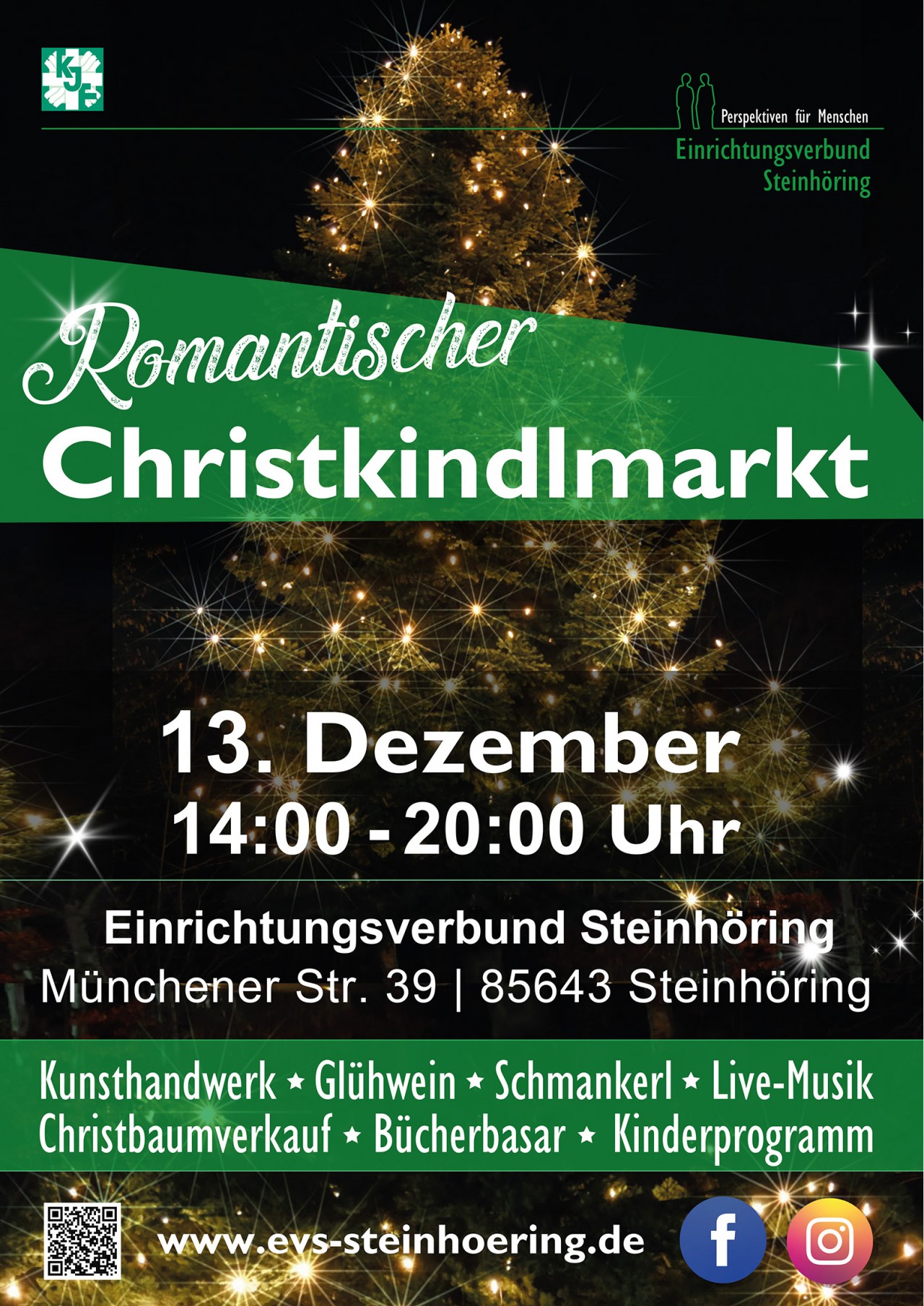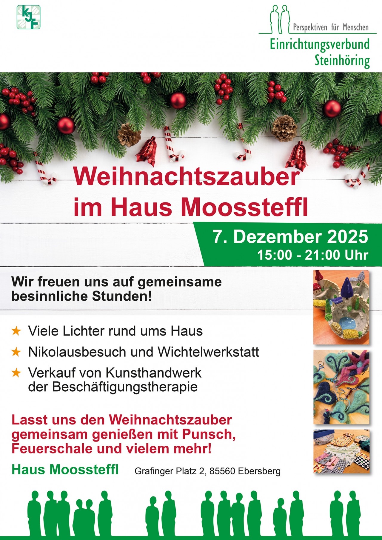 Der Einrichtungsverbund Steinhöring wartet gleich mit zwei weihnachtlichen Veranstaltungen auf – am 7. Dezember 2025 mit dem Weihnachtszauber im Haus Moossteffl und am 13. Dezember mit dem Romantischen Christkindlmarkt in Steinhöring.