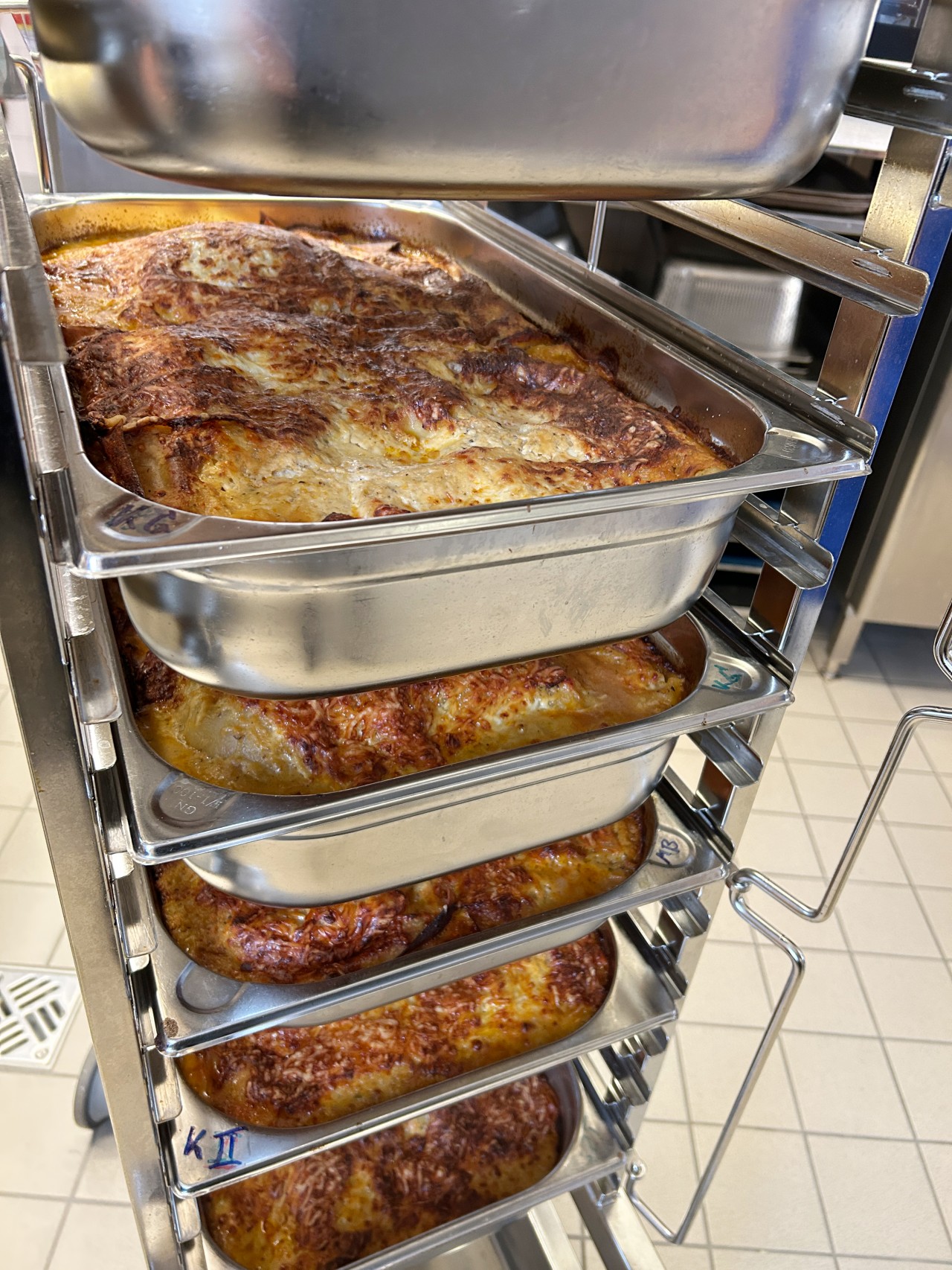 Elisabeth Stöckl weiß, was bei ihren kleinen Feinschmeckern gut ankommt und was eher nicht. Für heute kann sie sich mit ihrem Team entspannt zurücklehnen. 220 Portionen Lasagne und Möhrensalat sind fertig vorbereitet und warten nur darauf, verputzt zu werden. Und Lasagne geht immer.