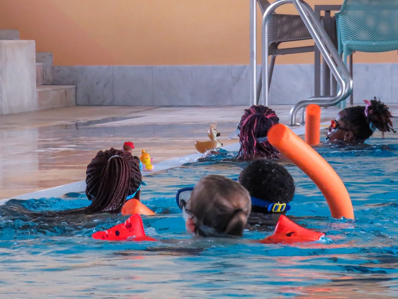 Alle Kinder kannten bereits das Element Wasser von gemeinsamen Schwimmbadbesuchen im Rahmen des Ferienprogramms der SPT. Sich sicher ohne Schwimmhilfe bewegen konnten sich jedoch nur wenige. Entsprechend groß war die Motivation, in diesen drei Tagen spürbare Fortschritte zu machen. Individuelle Förderung war der Schlüssel. Um bestmöglich auf die unterschiedlichen Voraussetzungen einzugehen, wurden die Kinder in zwei Gruppen eingeteilt. Während eine Gruppe ihren Schwimmunterricht erhielt, durfte die jeweils andere Gruppe im Nichtschwimmerbereich frei planschen und das Wasser spielerisch erleben.