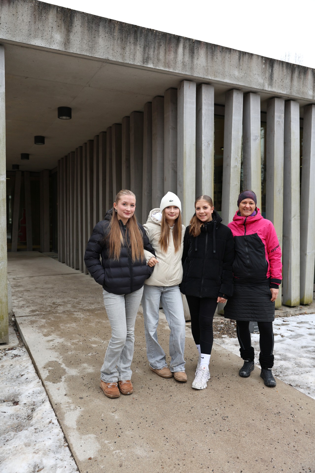 Die Teilnehmerinnen der Franz von Sales Schule: Rena, Manda, Aliyah und Birgit Pfänder (v.l.n.r.) vor dem Besucherzentrum der KZ-Gedenkstätte Dachau.